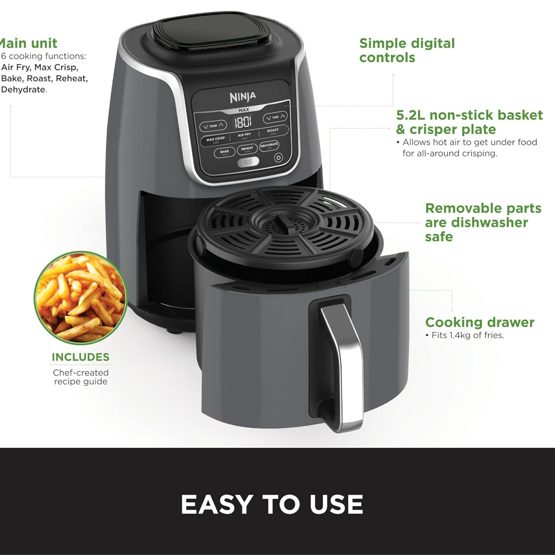 - INCLUDES: Ninja Air Fryer, Non-stick, dishwasher-safe 5.2L Basket & Crisper Plate. Chef-Created Recipe Guide. Weight: 5.2kg. Colour: Grey/Black.